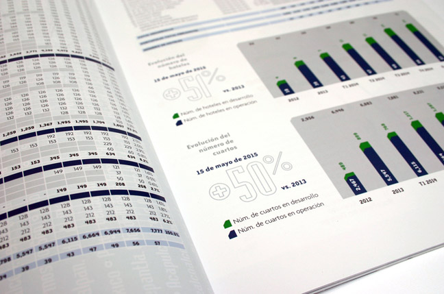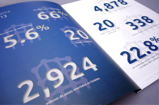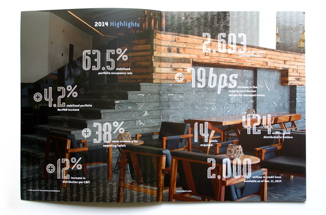 Annual Report 2015. With the hotel designs in mind that year, the idea was to create a minimalist editorial piece with thin lines and very modern graphics. New colors were also added to the corporate image palette that year.